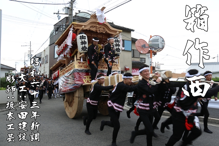 ![]() 【箱作西】 昭和63年大工:安田建設、彫師:坂本工芸によって新調。昨年、安田建設によって大修復、灰汁洗いが行われました。 (下荘地区) |