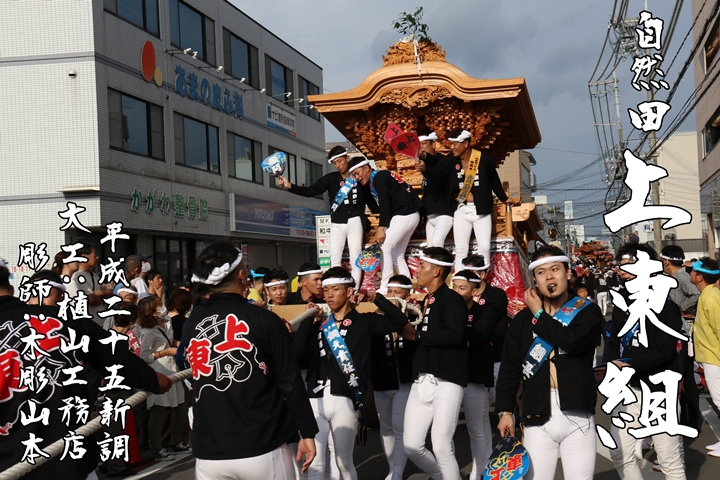 ![]() 【自然田上東組】 平成25年大工:植山工務店、彫師:木彫山本によって新調。岸和田だんじり大工の老舗、植山工務店の出世やぐらです。 (東鳥取五地区) |