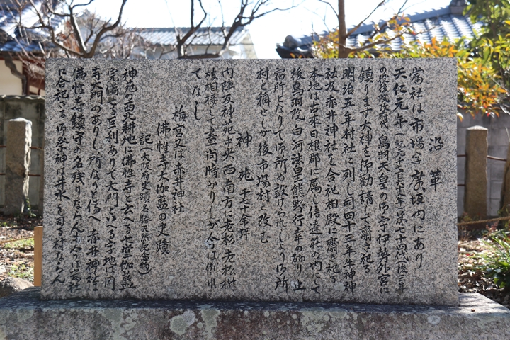 赤井神社(又は梅の宮)は淡輪文書にあるまぼろしの大巨刹佛性寺の守護神であった佛性寺は織,豊,の根來攻めに焼失したと云われ、後年大阪府史蹟に指定され現在跡地に碑が建立されている