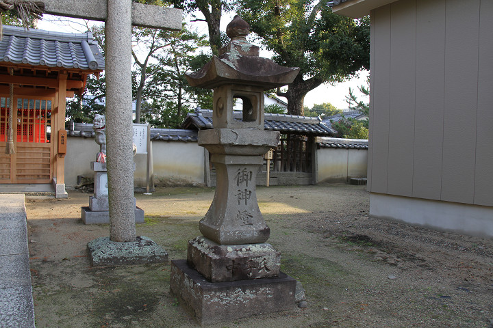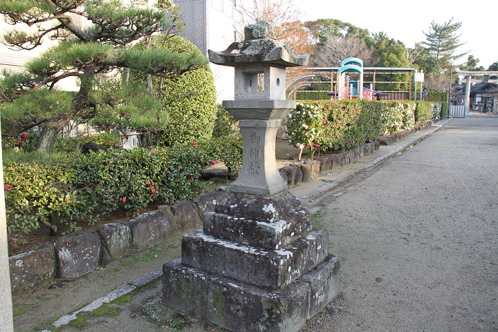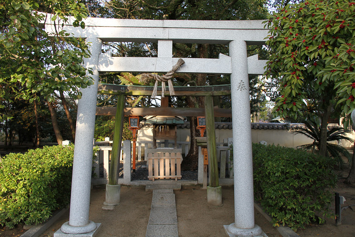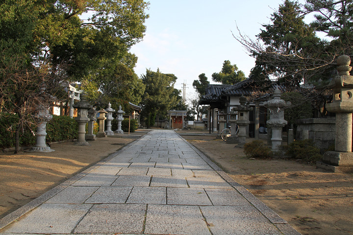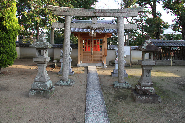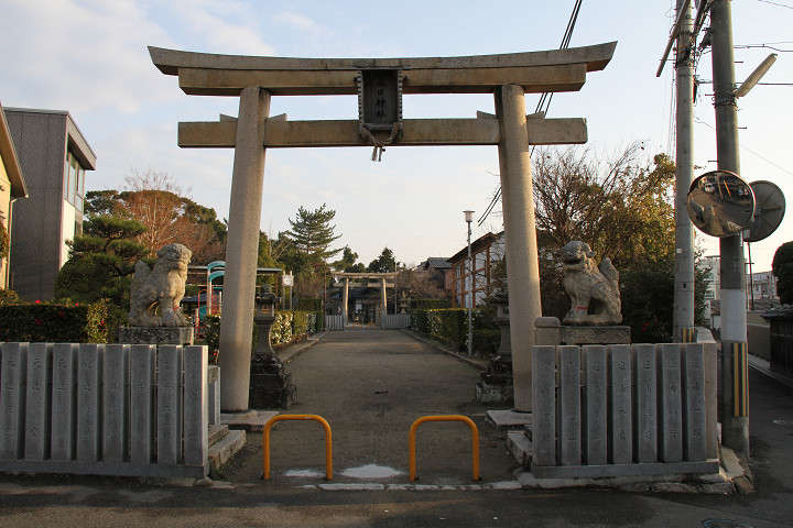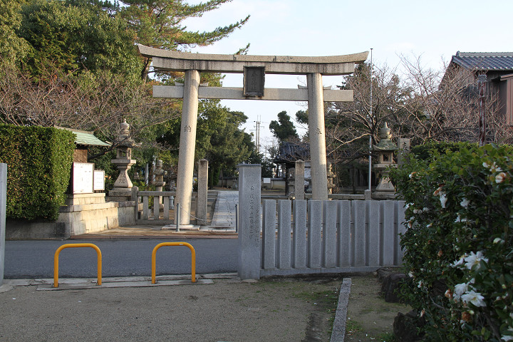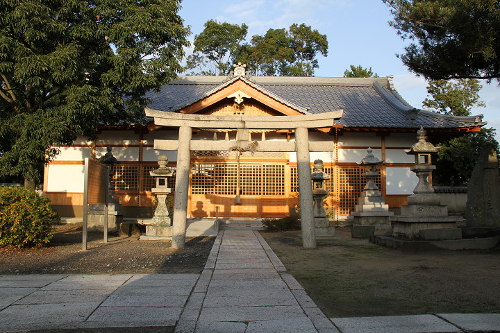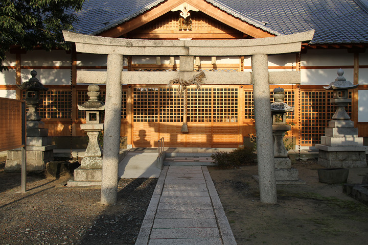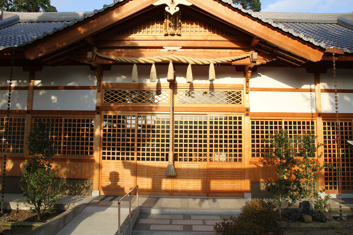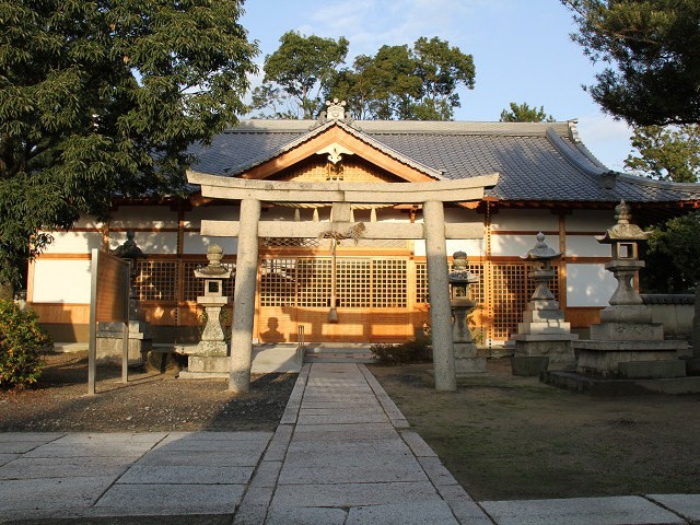 明治5年村社に列し、同40年11月10日字稻荷の村社稲荷神社(保食神)、字南出の同巖島神社(市杵島姫命)、字毘沙門の無格社多聞天神社(大山衹命)、字東出の同日向神社(太田命)、字北濱出の同事代主神社(八重事代主命)、字大將軍山の同大將軍神社(磐長姫命)及び大字嘉祥寺字村端の同八坂神社(素戔嗚命)を合祀し、同42年10月神餞幣帛料供進社に指定せらる。往時にありては北方田尻川の南岸より、舊加太街道の東に沿いて南に亘れる壱萬七千餘坪の境内なりしが、現在は境内外を通じて約五千坪の社地となる。末社に若宮神社あり。氏地は本地一圓。