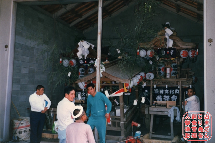 ![]() 昭和61年のやぐら部屋。 ![]() 昔の本幕。 ![]() 平成19年 − 提燈を「深日」へ変更。 ![]() 平成19年10月21日 − 先代やぐらの昇魂式を実施。 ![]() 平成19年10月28日 − 先代・下出のやぐらを搬入。 ![]() 平成19年12月9日 − 先代やぐらを解体。 ![]() 平成20年4月20日 − やぐらを譲受、入魂式を実施。 ![]() 平成22年10月3日 − 小島やぐら10周年記念深日・小島合同曳行を実施。 ![]() やぐら部屋 ![]() (地図をクリックすると、拡大します) |