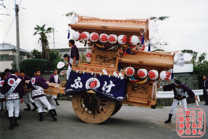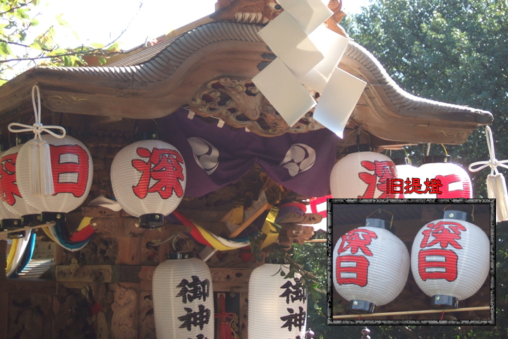 | ● 現在のやぐら 現在のやぐらは昭和61年に大工:吉岡利一師、彫師:木下頼定師によって下出のやぐらとして新調、同年9月7日日曜日に波太神社にて入魂式を挙行しました。平成19年10月28日日曜日に神上式を実施後深日一号へ搬入。一部修復を施した後、平成20年4月20日日曜日にやぐら部屋前にて入魂式を実施しました。提灯は白地に赤文字で「深日」。 |