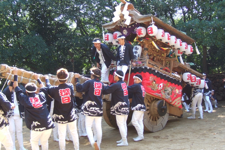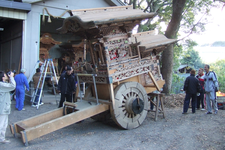 | ● 彫物図柄解説 【大屋根廻り】 ・鬼板 − 獅噛み ・箱棟 − 雲龍 ・懸魚 − 正面:鳳凰、 後面:雲に鶴 ・車板 − 正面:柴田勝家 勇力、 後面:雲に富士 ・小屋虹梁 − 雲海 ・枡合 − 正面:牛若 弁慶五条大橋の出会い 【源平盛衰記】、 右:新田義貞 稲村ヶ崎宝剣を奉ず 【太平記】、 左:楠公父子 桜井の別れ 【太平記】 ・虹梁 − 菊 ・欄間 − 正面:藤吉郎 一揆をしずめる、 右:藤吉郎 信長の初会見、 左:堀尾茂助 勇力 【太閤記】 ・長押 − 雲海 ・柱巻 − 右:昇龍、 左:降龍 ・小脇板 − 右:?、 左:? ・幕板 − 右:?、 左:根来合戦記 ・脇障子 − 右:吽形の唐獅子、 左:阿形の唐獅子 ・犬勾欄 − 正面:牡丹に唐獅子、 右:?、 左:? ・内勾欄 − 牡丹に唐獅子 ・擬宝珠勾欄 − 勾欄合:松竹梅、 束:力神 ・板勾欄 − 正面:波間に千鳥、 右:?、 左:倶利伽羅峠の戦い 【源平盛衰記】 ・縁葛 − 波間に千鳥 【小屋根廻り】 ・鬼板 − 獅噛み ・箱棟 − 雲龍 ・懸魚 − 松に鷹 ・車板 − 雪だるま遊び 【唐子遊び】 ・枡合 − 正面:児島高徳 櫻木に歌を詠む 【太平記】、 右:日吉丸 蜂須賀小六の出合い 【太閤記】、 左:曽我十番切 仁田四郎忠常と十郎祐成 【曽我物語】 ・虹梁 − 菊 ・欄間 − 右:佐生の合戦、 左:今川義元 討死す 【信長公記】 ・長押 − 雲海 ・太鼓周り − 雲に鶴 ・幕板 − 右:堀尾茂助 勇戦、 左:木津川口の合戦 【信長公記】 ・擬宝珠勾欄 − 勾欄合:梅,松,竹,牡丹、 束:力神 ・縁葛 − 牡丹に唐獅子 【本幕】 ・本幕 − 正面:保存会の紋に深日の文字、 右:牛若丸弁慶 五条大橋の出会い 【源平盛衰記】、 左:加藤清正 虎退治 【太閤記】 |